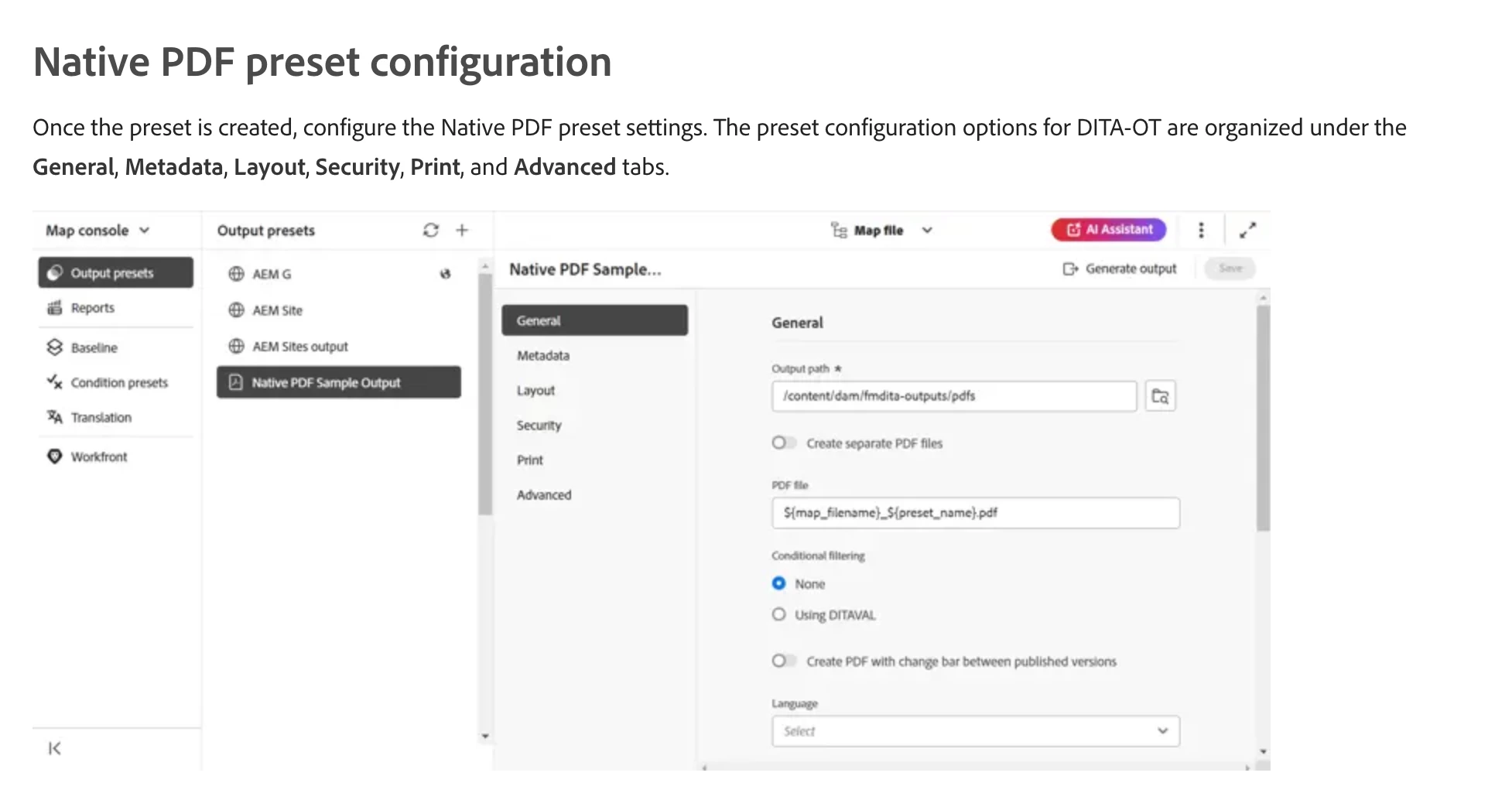 AEM Guides Native PDF: Missing "Create PDF with Change Bar between Published Versions"