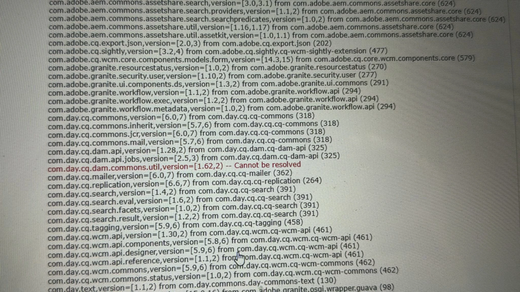 com.day.cq.dam.commons.util, version=[1.62,2] -- cannot be reoslved