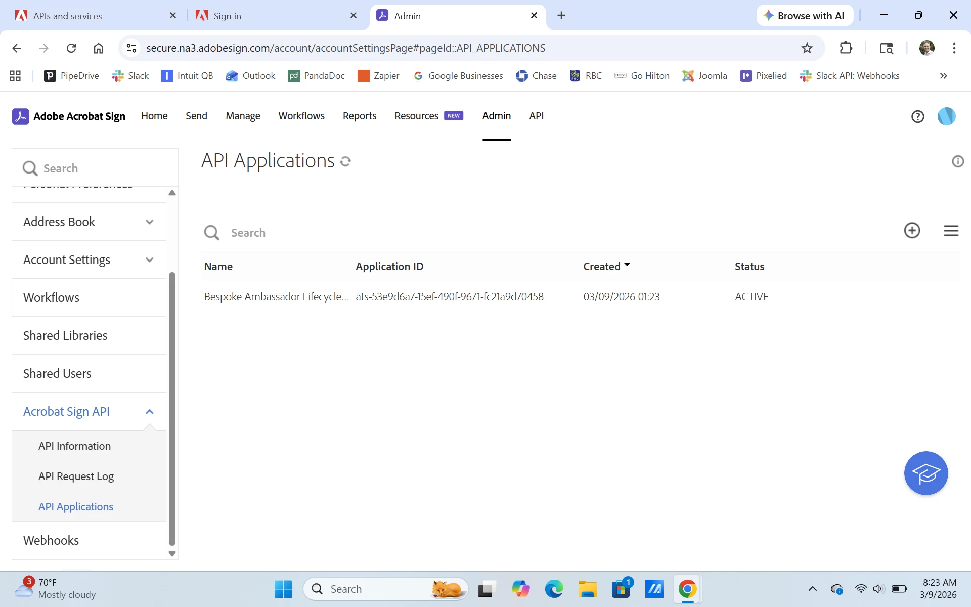 After establishing a developer account, I gained access to the Adobe Acrobat Sign API section and was able to create a new application from the Application List page for OAuth 2.0. The Adobe Acrobat Sign license was attached to a different user in our organization at that time. However, we moved the application license from the initial user over to me. After that when logging back into Adobe Acrobat Sign, my Developer API Access disappeared. Snapshots of when I had access and then after access was gone are below. I don’t know how or who to contact to help restore it.