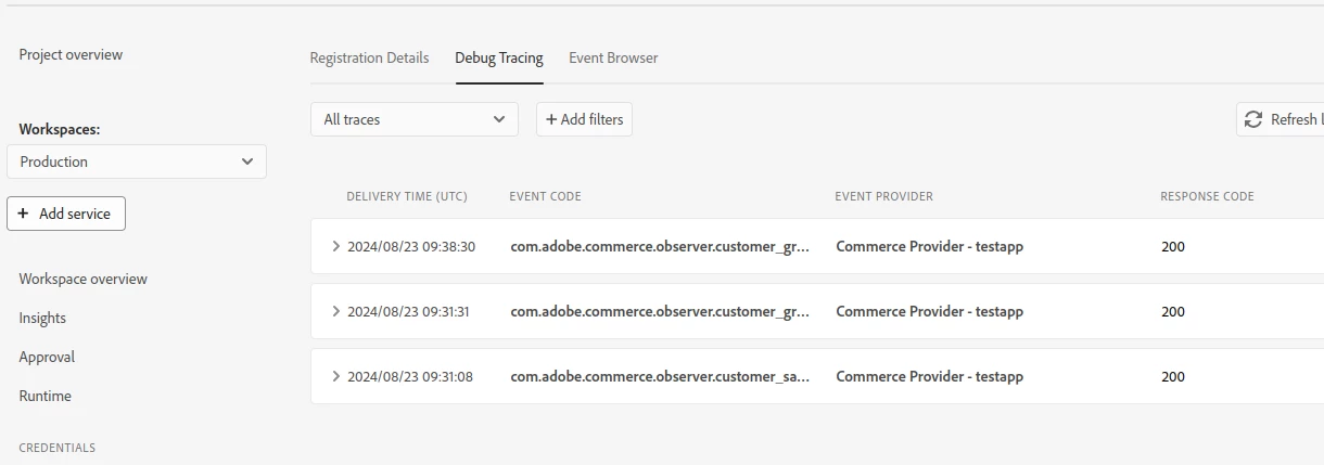 not able to get event in debug trace(adobe developer console)