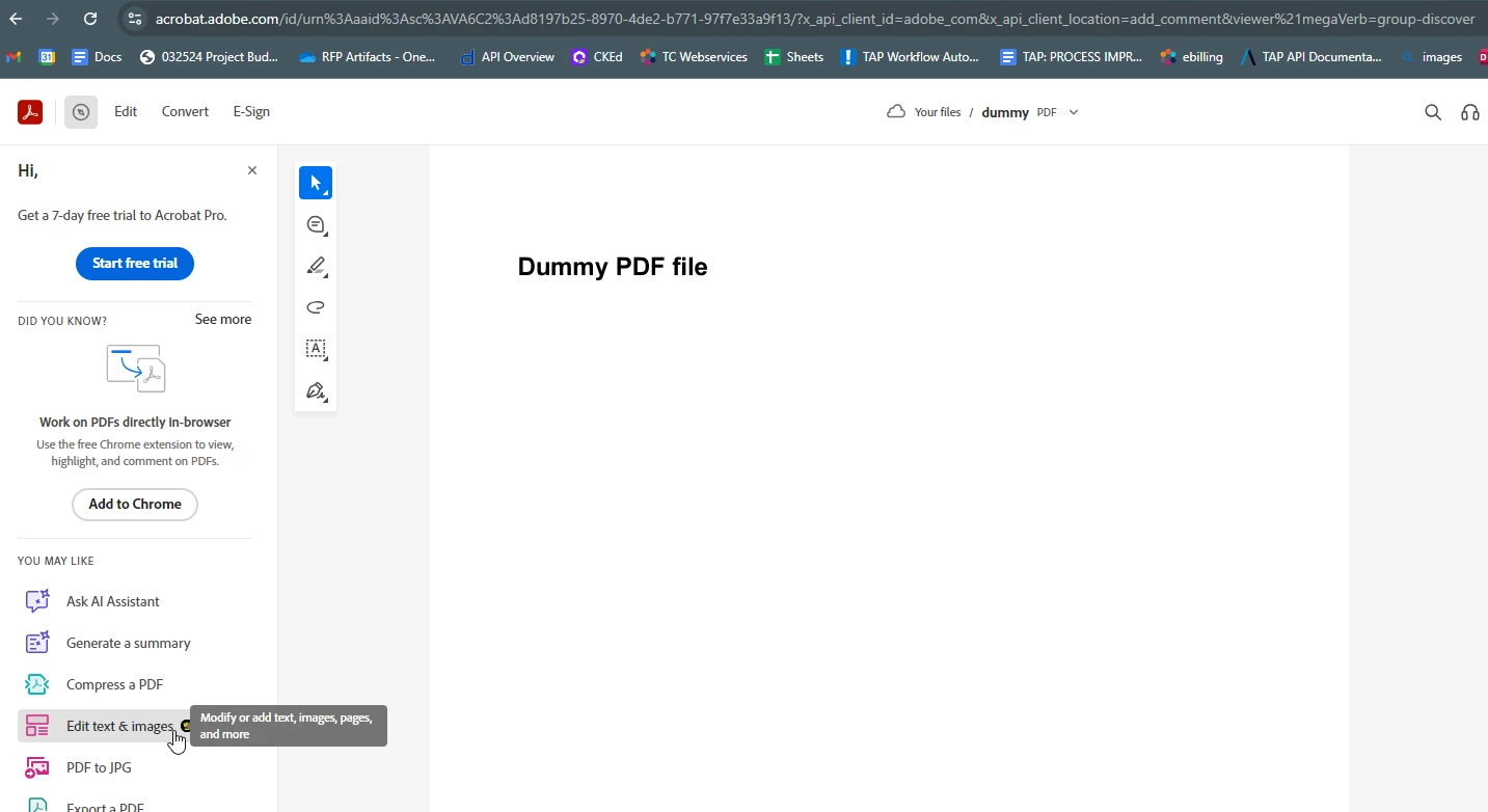 Wondering if we can send a doc to Acrobat online for edit via api (pdf-editor). Similar to how it works when you upload a doc to https://www.adobe.com/acrobat/online/pdf-editor.html (note the cursor hovering the edit tool pictured below). I was unable to find a use case that does this on the pdf-services resource site.