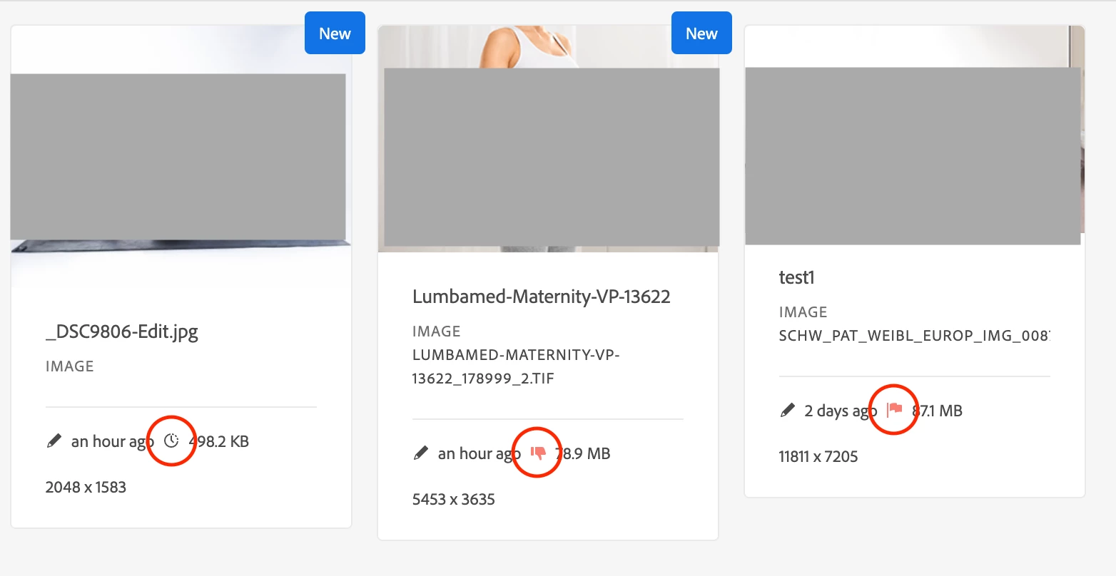 A grey clock icon for assets that have the property./jcr:content/metadata/dam:status = Changes Requested