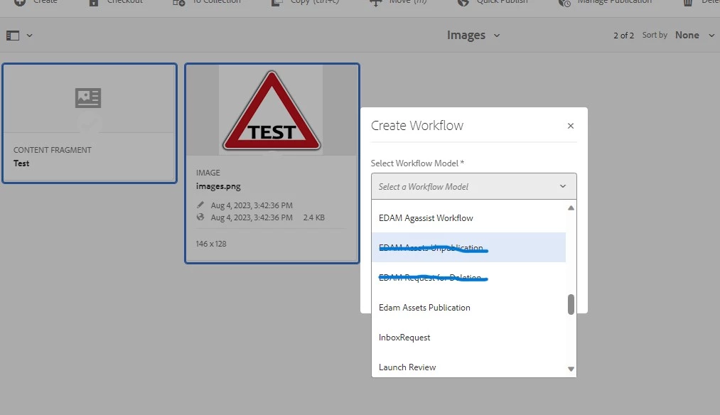 We have a requirement where we need to stop showing some workflows in the create button that comes in the top in AEM Author instance when multiple assets are selected in our certain DAM path.