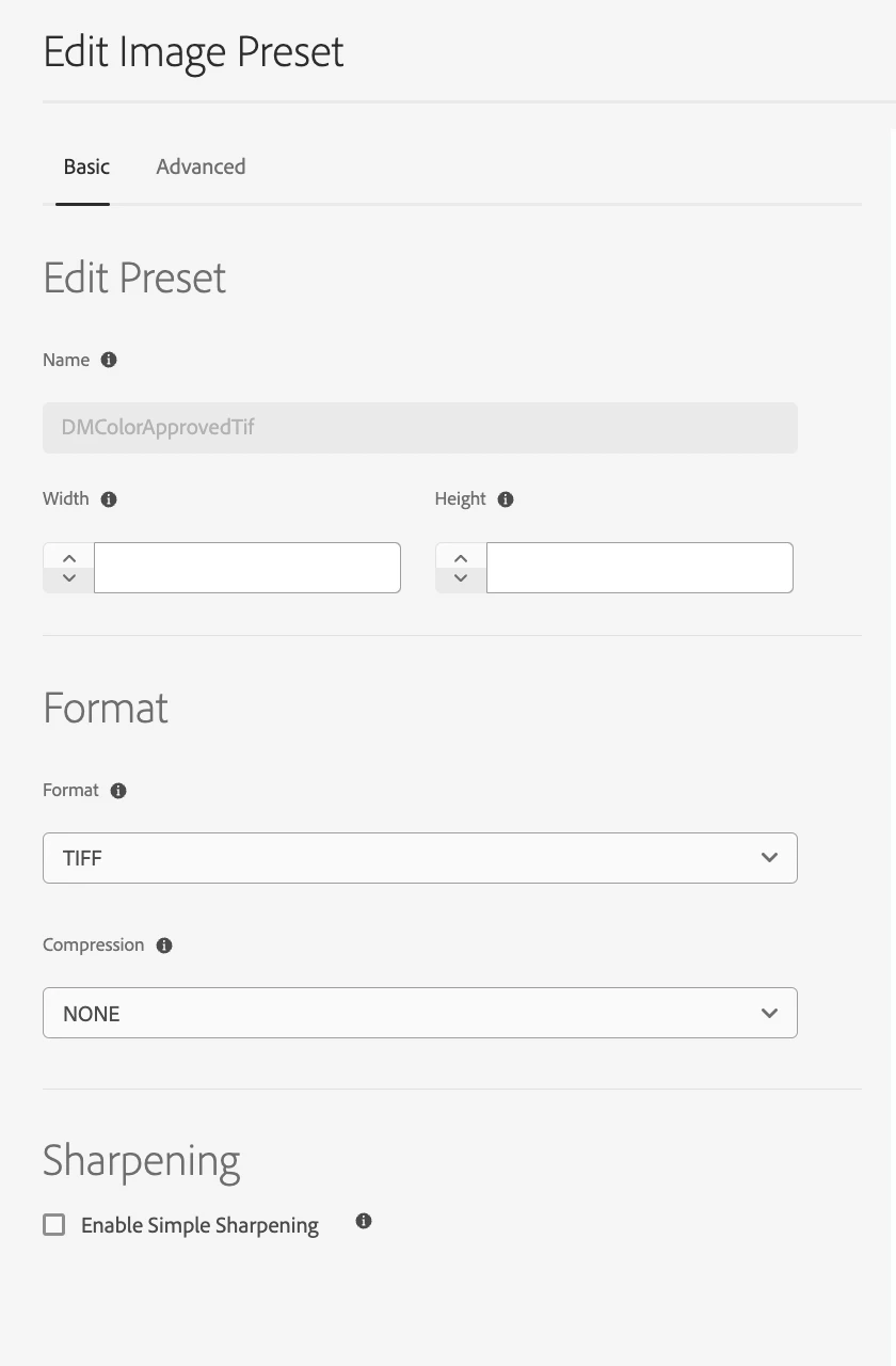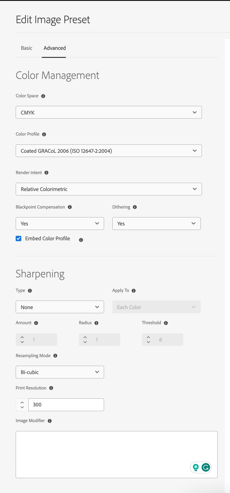 For the input image, we are generating a CMYK Tif DM rendition. The following image presets are created for this purpose.