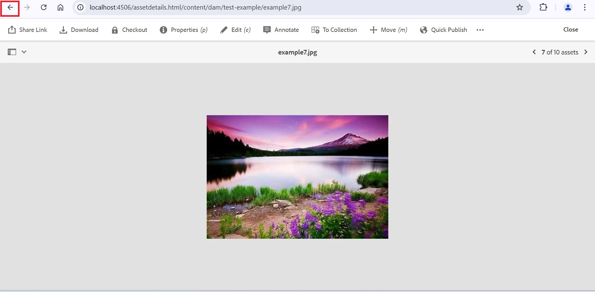 Step 2: The asset is opened, and now if the browser's back button is clicked.