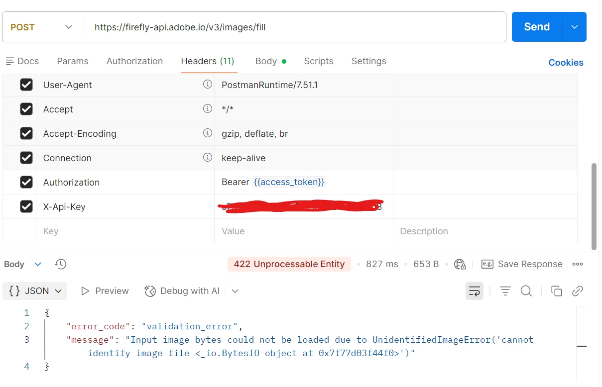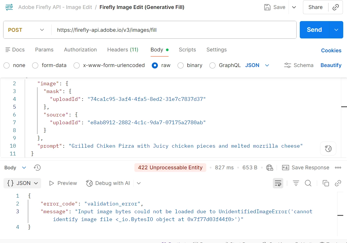 I am trying to edit the image by utilizing the masking and the original source image. While using the Firefly image fill APIs, I encountered a problem indicating that Firefly is unable to read or process the images.