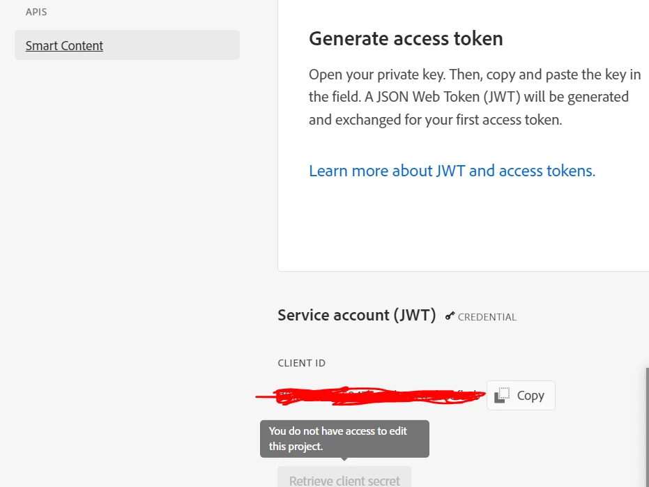 Hi, I am trying to integrate with Smart Content API, then I am getting all the details which I have to copy to my AEM Smart Tag service in my local instance but then "Retrieve Client Secret" is not working for me I have clicked on it and it says "I don't have the access to edit". So, can you please help me as I have to paste this in my local configurations.