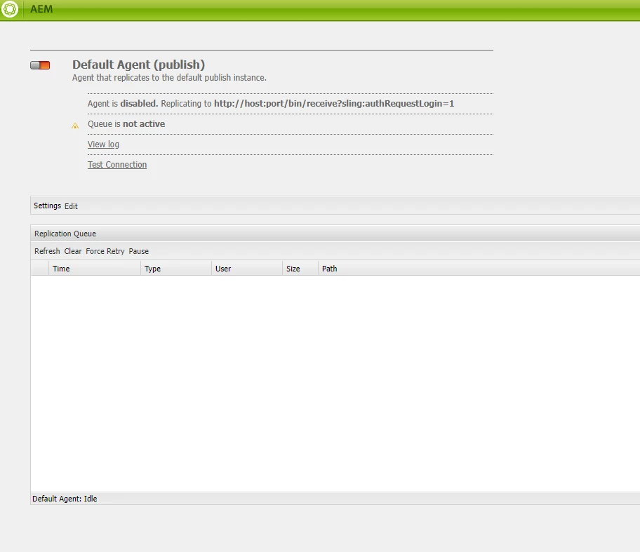 - Agent is disabled. Replicating to http://host:port/bin/receive?sling:authRequestLogin=1