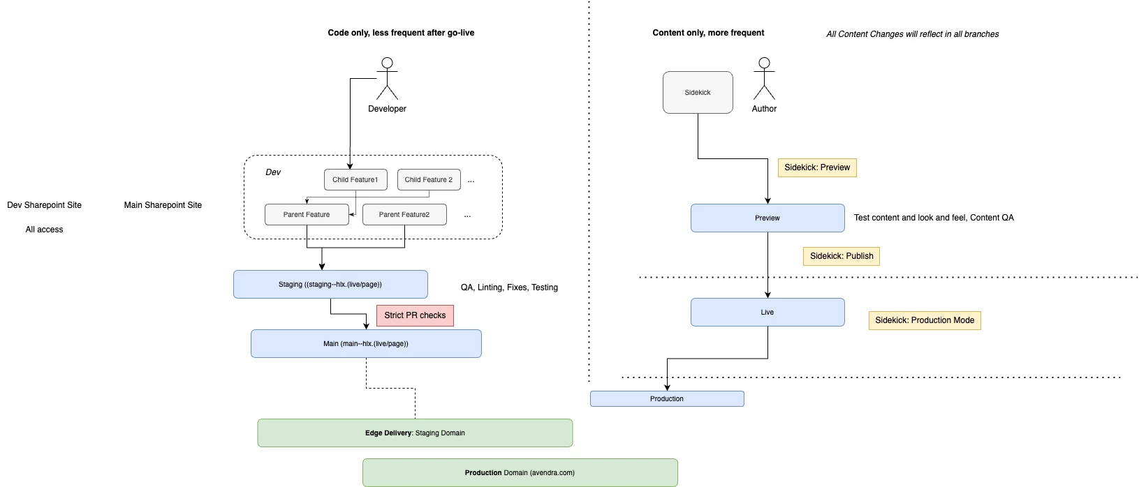 Context: Our team is currently trying to optimally setup a client's project, and we want to create a smooth CI/CD system which will take into account both the development side of contributions as well as the actual content authoring side (client side) of the flow. The tooling and process we're utilizing is as such (see attached screenshot as well of our current infra thinking & layout):