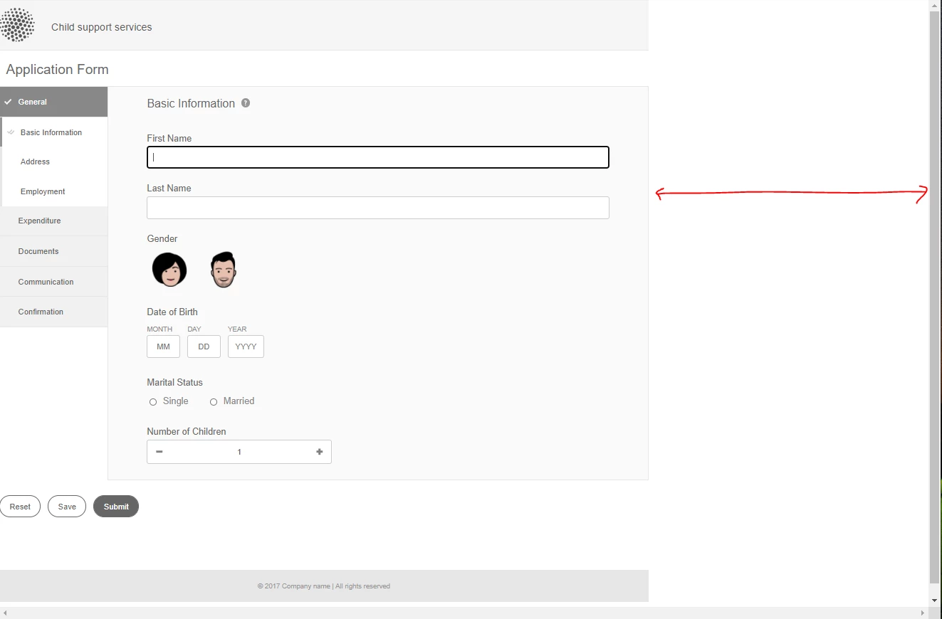 By default, the adaptive form page content is centered and is not set to adjust to the width of the browser.
