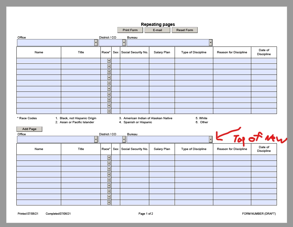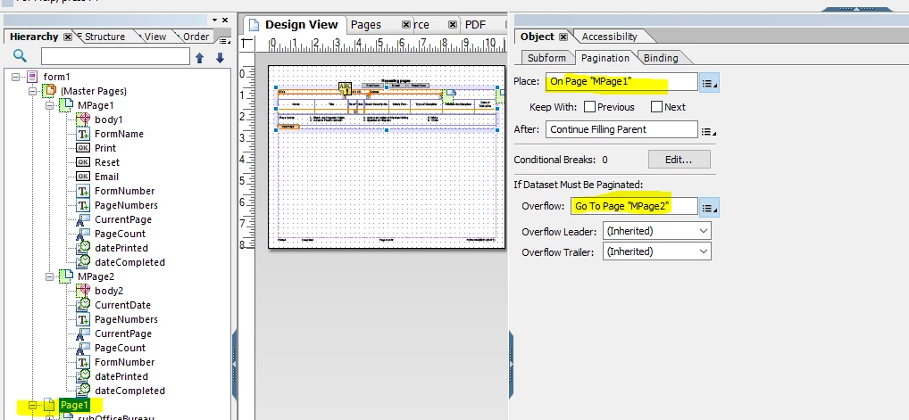 I have a one page form that is dynamic as the user can type multi lines in a table cell and the form can grow to multiple pages. I would like the user to have the ability to add an instance of the page but the new instance needs to always begin on a new page using the first master page (MPage1), this way the header shows for each instance of the page. However, if any instance of the page grows to more than the one page, it needs to grow onto the second master page (MPage2) where there is no header. If anyone knows how to make this happen, I would appreciate the help. I cant quite get it to work exactly how I want.