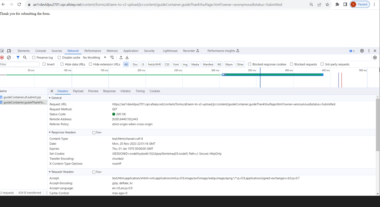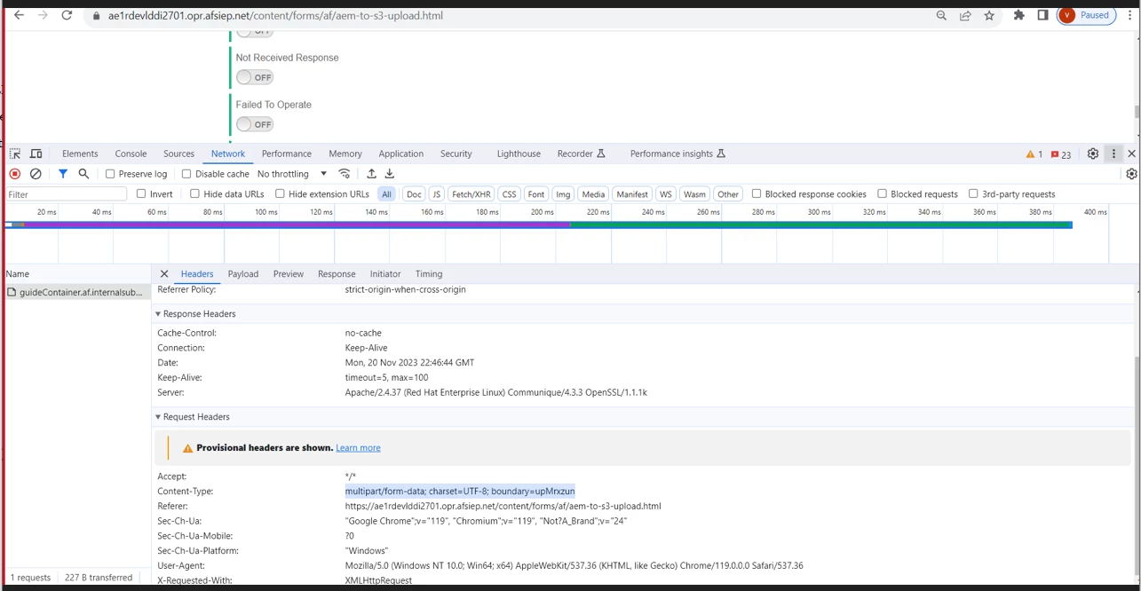 We have a form which when submitted invokes a workflow and submit the DOR to Amazon S3 bucket. It works fine via publisher though giving 204 form dispatcher. Please advise