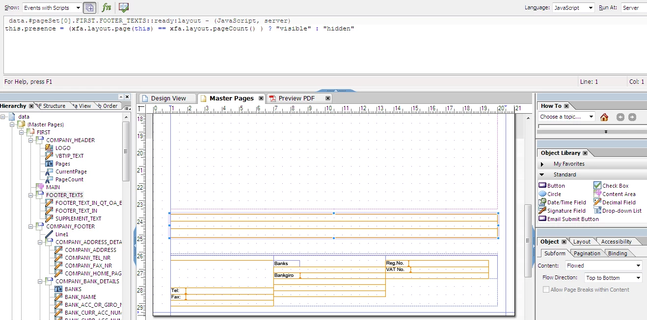 I have a Subform, called FOOTER_TEXTS and containing 3 text fields, just below and outside of the 'MAIN' Content Area and just above a fixed (static) Subform called COMPANY_FOOTER.