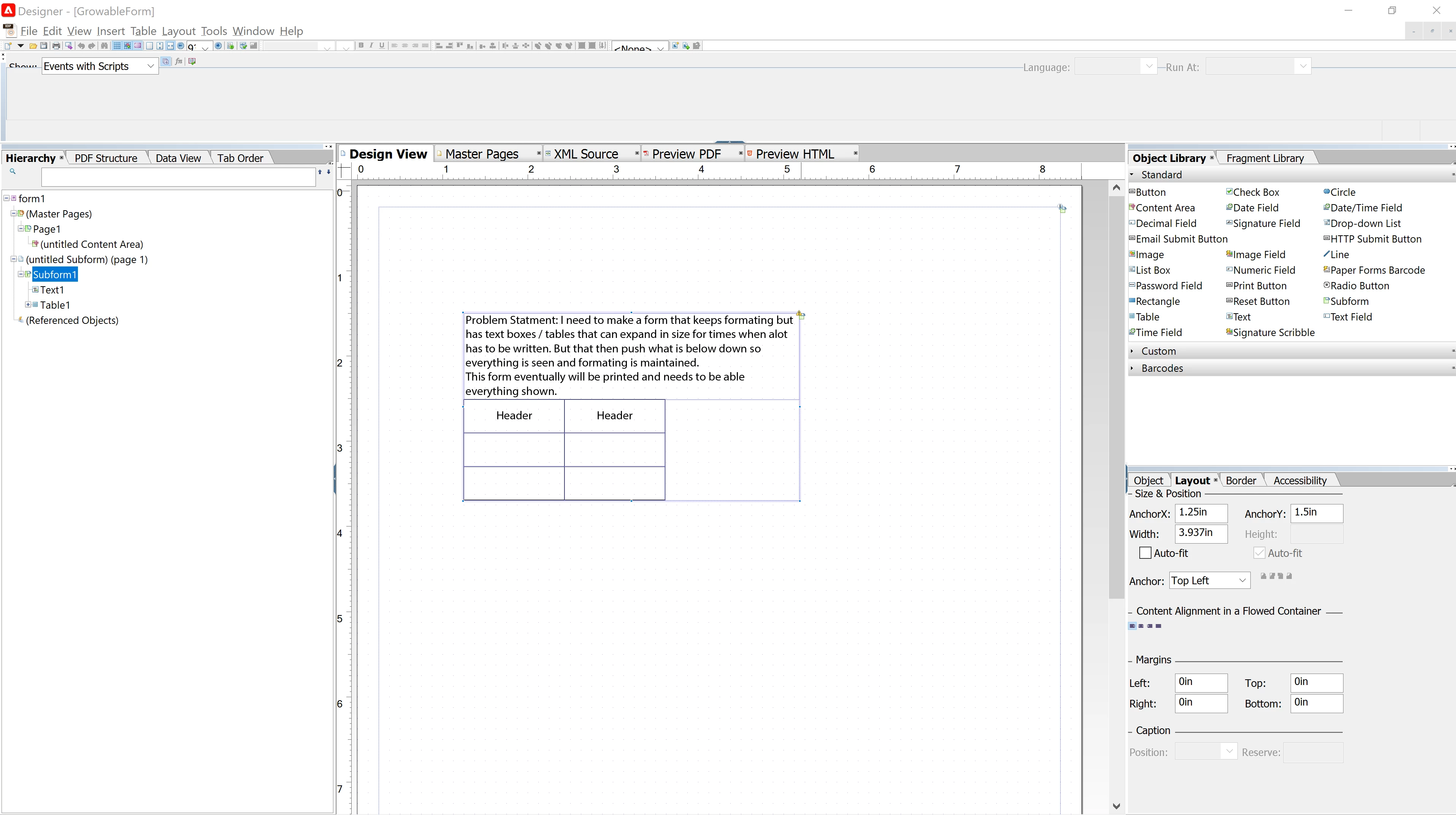 I need to make a form that keeps formating but has text boxes / tables that can expand in size for times when alot has to be written. But that then push what is below down so everything is seen and formating is maintained.