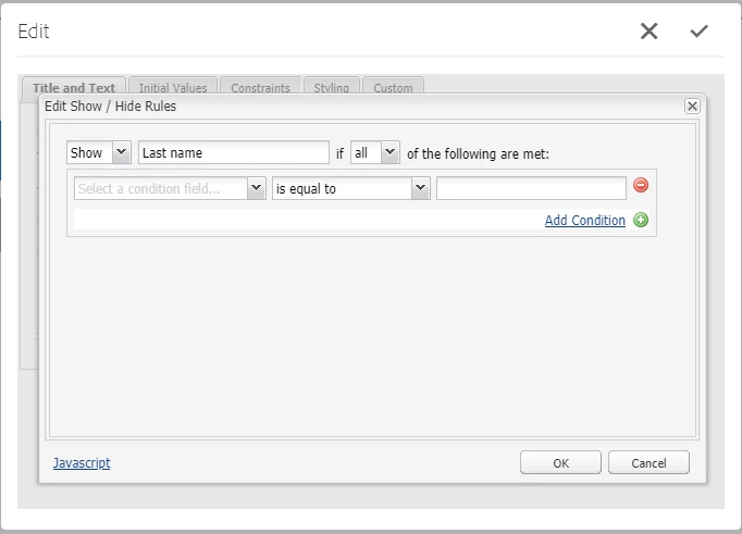 I'm referring to the specific showhide xtype which handles show/hide logic for the HTML elements in a web form, not widgets in a dialog. The values captured in this xtype are passed along to the Abacus JS which handles form logic for components that extend OOTB form field components. Below is a screenshot of the showhide xtype. Clicking that checkbox in the background dialog opens the 2nd dialog that allows authors to configure show/hide logic for elements that are present on the web form.