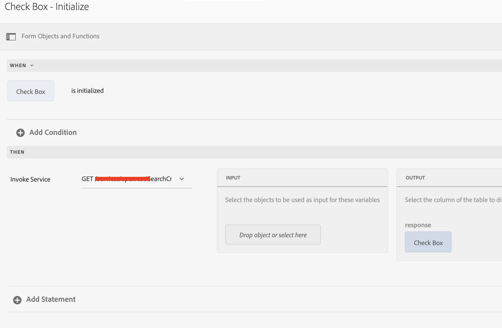 and the other option we tried is to invoke the service of FDM into checkbox initialize event like in the screenshot but no luck there too