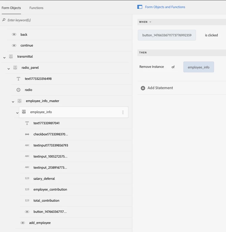 I have a repeatable panel in an Adaptive form built on core components, with a remove button inside the panel and an add button outside. When I use the rule editor to configure the remove button to delete a panel instance, it consistently removes the panel below the one I selected. For example, if I add three panels and try to delete panel 2, panel 3 gets deleted instead. While this could have been resolved using the Code editor, that option isn't available to me. My constraints are that we're working within a headless delivery model, so I can't use guidebridge, and custom JS functions aren't feasible because they would require passing the SOM expression, making the JS form-specific. Given these limitations, I would appreciate any suggestions on how to address this issue.