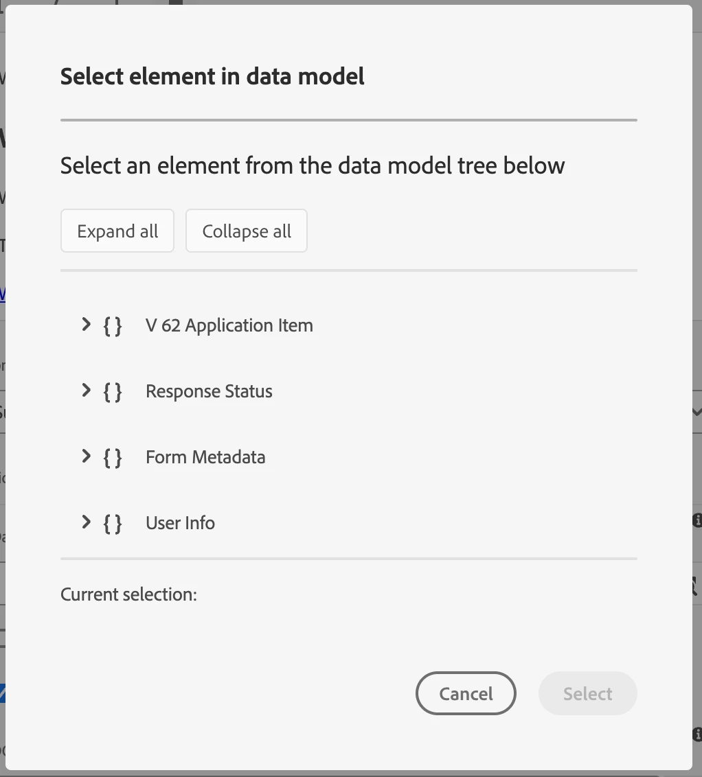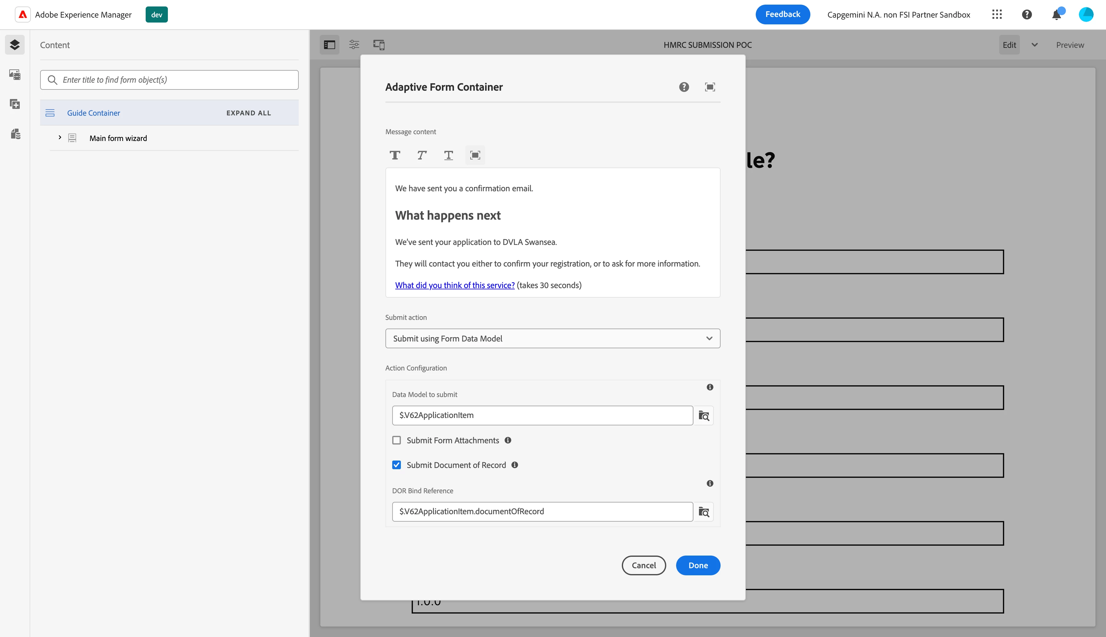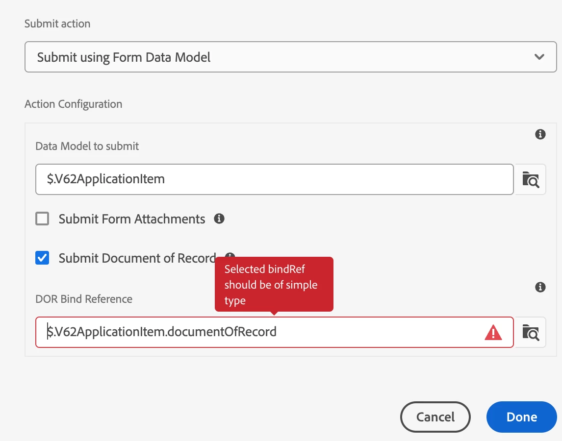 When configuring the guide container for a form you can specify what you would like to submit alongside the form fields which have been bound to a form data model. In this example we are trying to submit the Document of Record alongside our form. This requires a DoR bind Reference to be configured, however, this is unclear as to what should be selected here. Binding to our top level model object causes an error which says 'Selected ref must of simple type'. Binding it to a string property does not produce a DoR within the form submission payload.