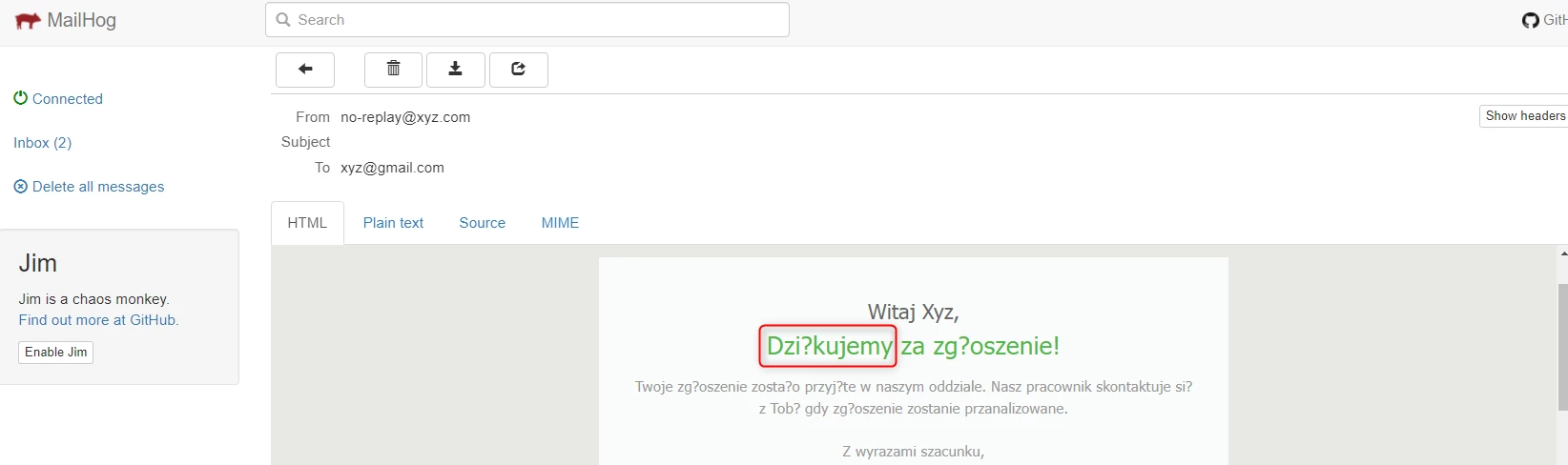 I am using mail hog locally to test this feature and this is what I get