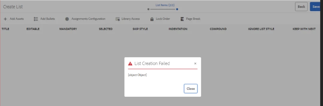 - On saving it is failing with error [object Object]. Log shows following error. Screenshot attached too.