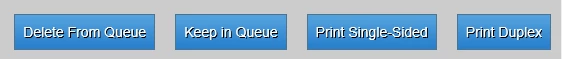 They do pretty much like what you would expect. Delete makes the form go away. Keep in queue basically saves all the edits, and invokes some workflow and the form is saved back as a new copy in the user's todo queue. Print Single-Sided or Print-Duplex essentially do the same thing from the user perspective, that is, a printer dialogue box opens in the browser and the user must select a destination printer or hit cancel. Under the hood, there are some formatting tweaks depending on which option is selected, and then it is sent off platform for another server to render into a PDF and store to their "Imaging" solution.