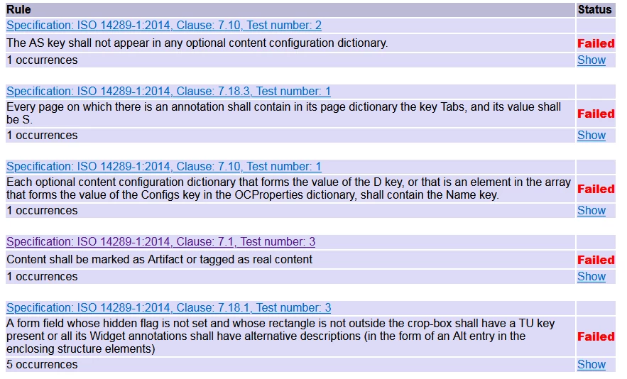 please I need to know how to make accessible objects like: text field, data fields and the other dynamic ones. I've just set the order through the tab "tab order" and added a tool tip from the tab "accessibility", then I set up all the Form Level Validation Settings. It works correctly with the screen reader but it doesn't pass the validation on "Vera PDF" software and these are the two errors reported: