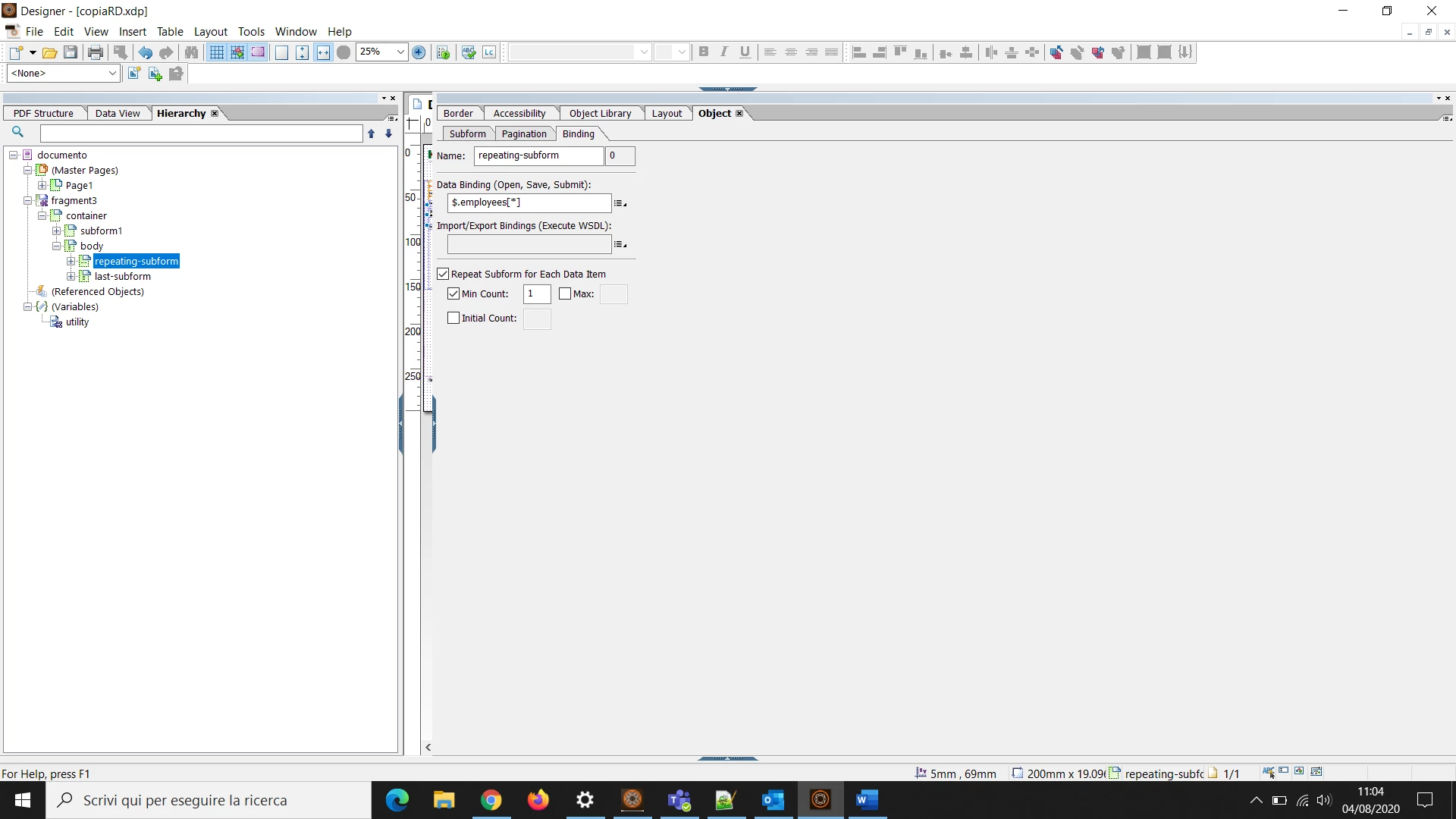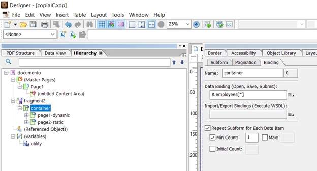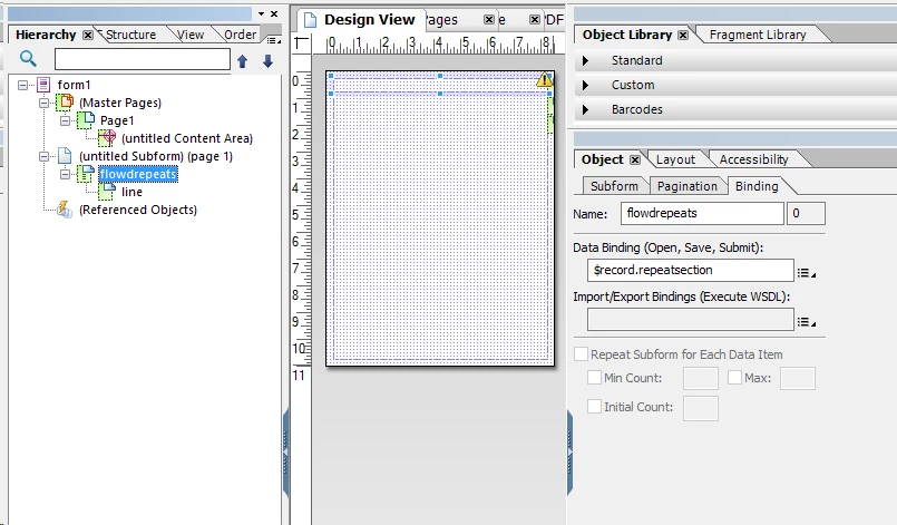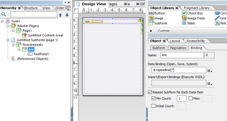 I would like to ask a question about the "Repeat Subform for each data item" option present in the Aem Forms Designer in Object-> Binding. If I connect the element I want to repeat to the data of the XMl file through the "Data binding" field and select "Repeat Subform for each data item" the result I see in the preview is correct but it gives me a warning like "The maximum repeat value for this subform is set to a higher value than the data connection" if the number of connected data is equal to 1. Is it possible to use the option whether the number of data is > 1 or equal to 1? I have tried with different values also on "Min count"and "Max count" but the warning remains.