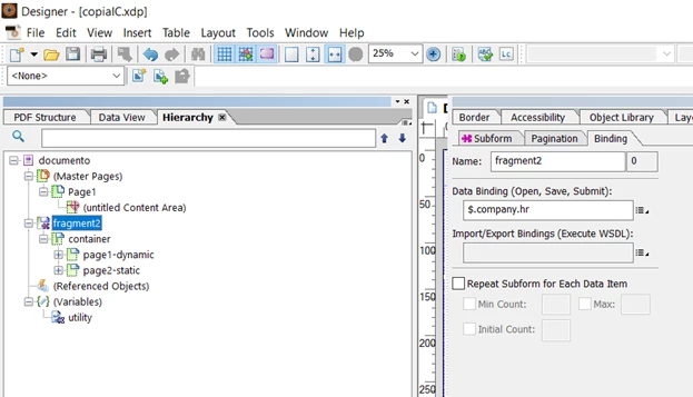 I tried to do as you wrote, in one case it works, in the other it doesn't. I try to explain better (I don't speak good English): I created a form that uses fragments. In the fragments I inserted the binding as indicated. If I preview directly from the fragment files, everything is ok, if instead I run the form that includes them, it displays all the pages only for one fragment. For the other ones it is as if it found only one page and did not see the repetition. Fragments use the same data in the XML. In addition, if from the main document I calculate the number of occurrences of these data in the XML it gives me a higher number than the one actually present, while it gives the correct number if I remove the fragments.