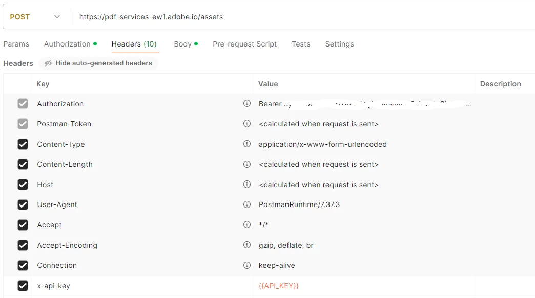 I have made a POST call to https://pdf-services-ew1.adobe.io/assets