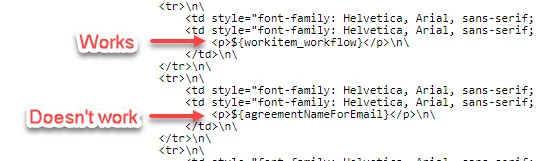 I have a form Workflow that maps some variables from a form submission, sends an email with a custom template that references some of those variables, then triggers an 'Assign Task' workflow step. The 'Send Email' step works perfectly, it includes the data form the form submission in the template as expected (via something like ${variableName} in the template markup). However, if I do the same thing in the 'Assign Task' workflow step, the same variable does not work. It just gets printed in the email as plain text. This is despite other default Workflow variables in the same email template working correctly (ex. ${workitem_title}).