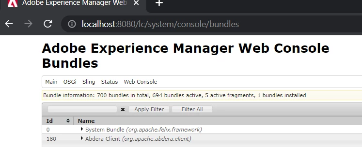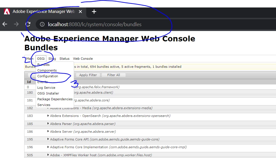 Last year while troubleshooting another problem, Pulkit help me access http://localhost:8080/lc/system/console/configMg. If my notes are correct, Pulkit told me to use http://localhost:8080/lc/system/console/bundles, but before I can access this site, I had to logon to another site. However, I cannot find the address for the other site.