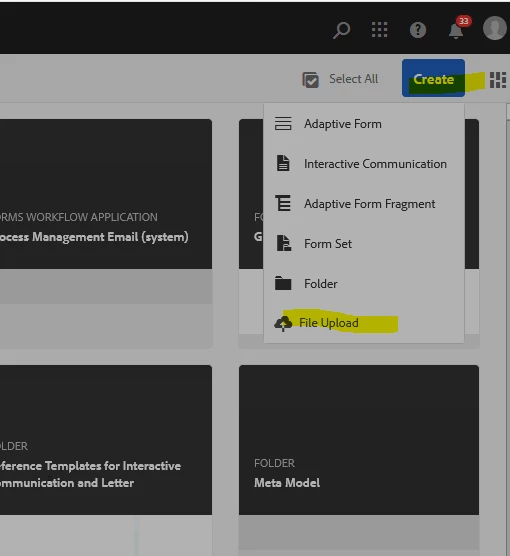 ok, you want to upload it to the repository. Start the Forms administration, goto Forms and Documents, use Create button for File Upload