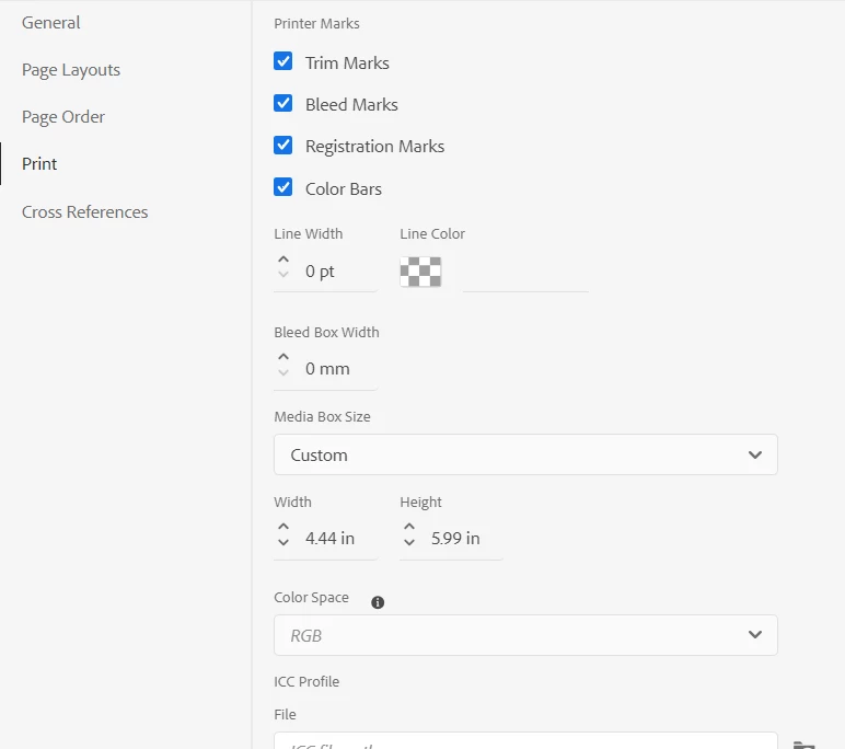 how to adjust/align this color bars, registration marks, trim marks and bleed marks.