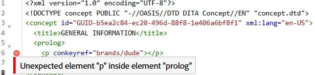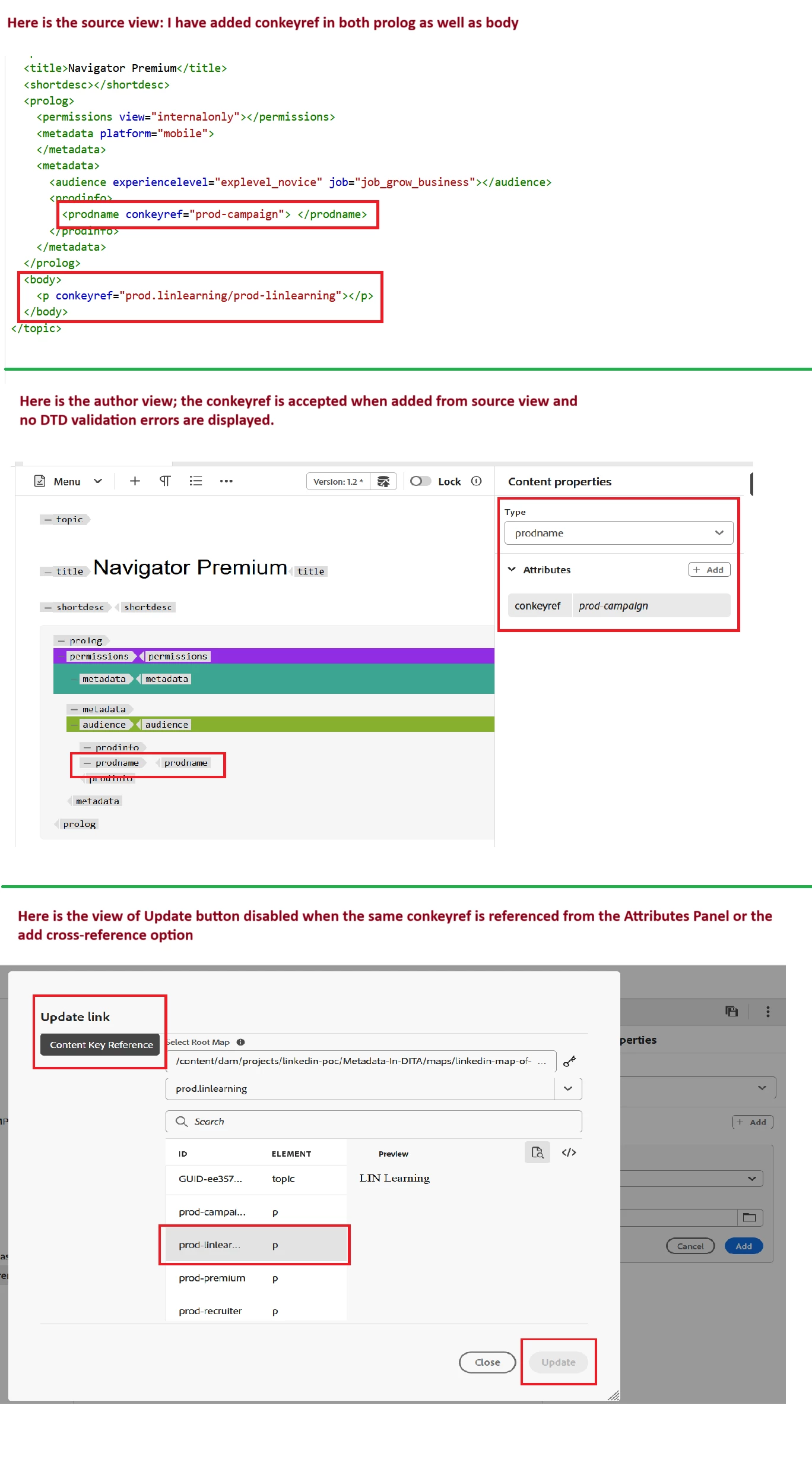 I want to use conkeyref to add values for elements in the prolog, for eample, prodname or category. I have created the required keys and bound it to the map/topic. I am able to add the conkeyref in the content of the topic, say within a <p> tag, but not with the Prolog. The key list is displayed, but upon selection of a key, the Update button in the dialog box is displayed. So, I used the source mode, and added the conkeyref. It picks up as conkeyref within the prodname or category is DITA valid.