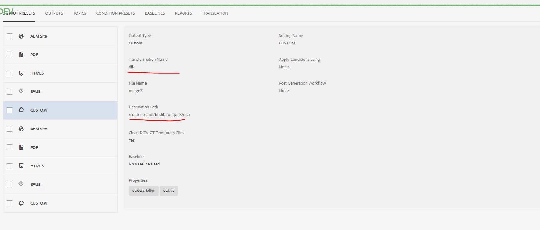 1. How do I generate output in /content/dam/fmdita-outputs/dita that is not zipped. I want the output in a folder, just like how the json output is created.