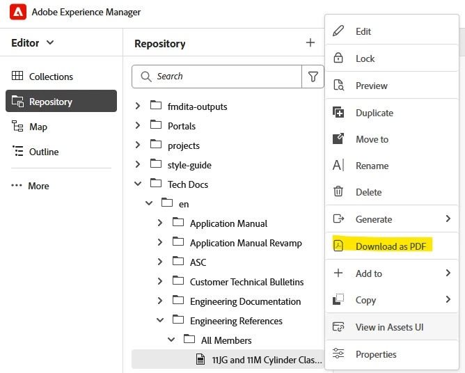 With above two conditions the option "Download as PDF" is displayed on the context menu options of a topic/map.