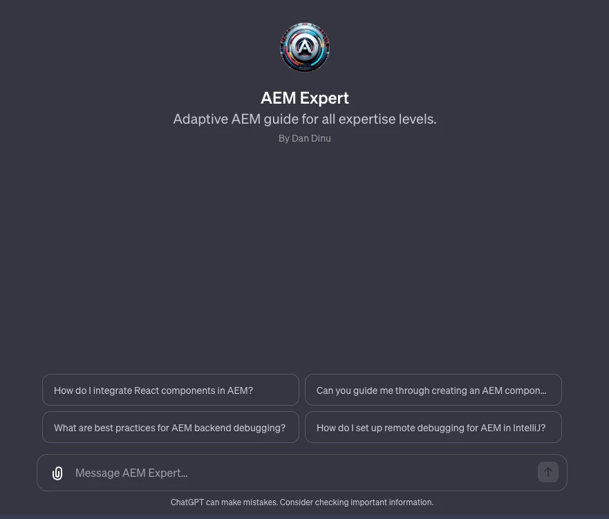 "AEM Expert" isn't just another bot but a new assistant powered by OpenAI's ChatGPT, designed specifically for AEM. As a single developer, I've tried to put in all my dedication and resources to make this a top-tier assistant for AEM debugging and problem-solving. I wanted to provide a centralized, accessible source of information for AEM issues. It may sound ambitious, but the bot has already ingested all the public AEM documentation and can provide solutions on a wide range of topics.