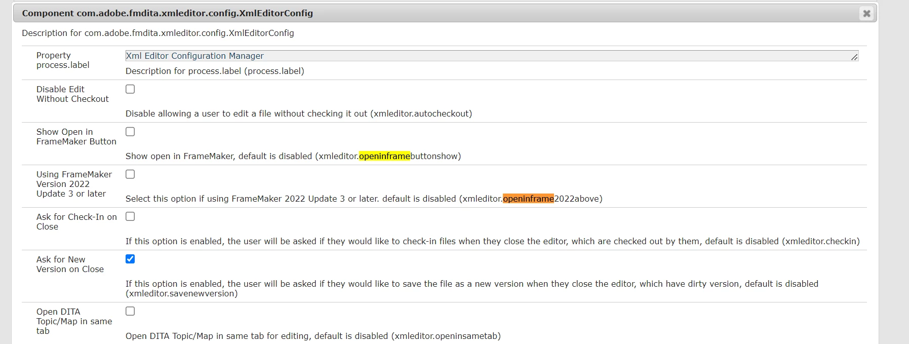 Open in FrameMaker" option exists when a a dita asset is check marked. We don't want that option to be enabled, so we have unchecked this option in configMgr. I have also tried cycling the setting on my instance but it has no impact on the behavior. Do we have any other workaround to get this option disable while marked on dita assets. Including that AEM Guides version has also been updated to 4.6.0. Thanks in advance!