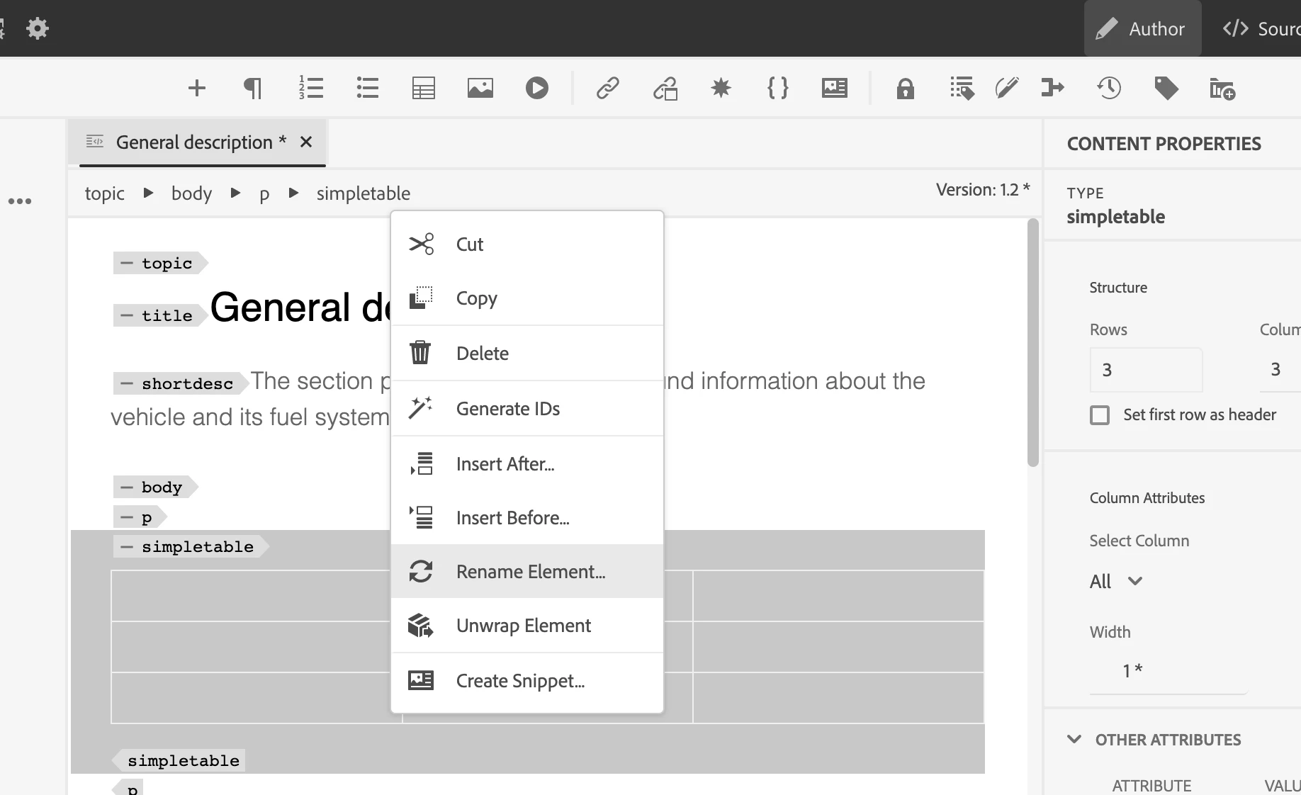 Copying and pasting content from Excel results in a <simpletable> instead of a <table>, and there doesn't seem to be a way to convert it from a simple table after it is in the DITA file.