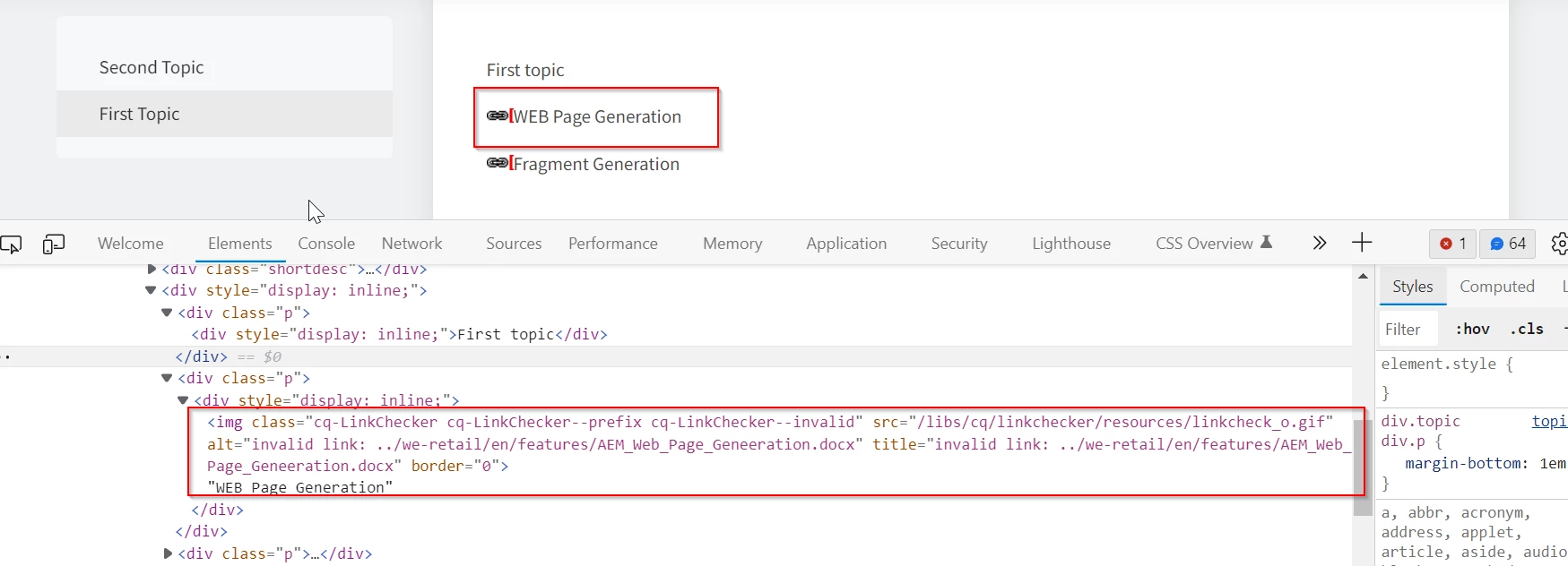 - And before you publish the content to AEM Site, you need to add a rule in "elementmapping.xml" to indicate the publishing process to handle this differently, see [B]. With this configuration the links to docx type files will point to their original loction in AEM Assets. (note that when you update elementmapping.xml you need to follow additional notes given in Installation and Configuration guide page 106)