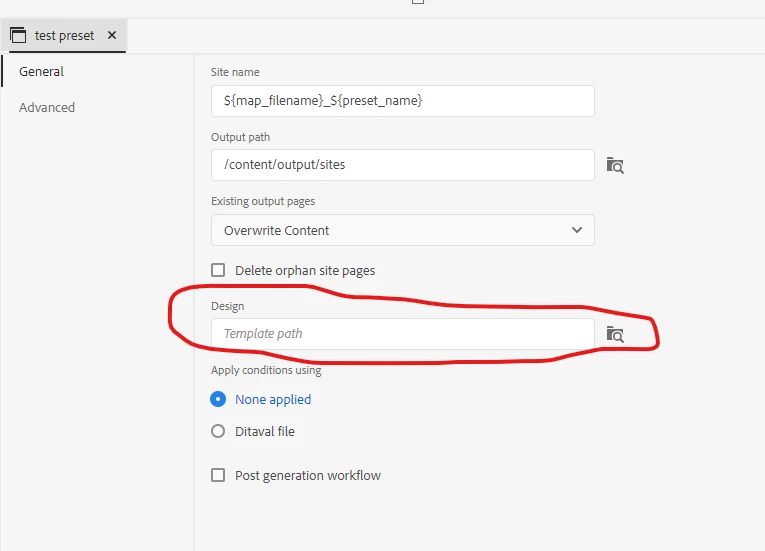 We have configured the Default Template in the OSGI Configuration (com.adobe.fmdita.config.ConfigManage) to display the default Design template as configured.