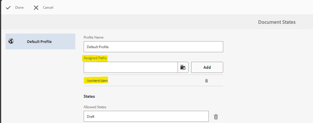 2. Ensure that a valid path is assigned for the document states. The default and recommended path is /content/dam.