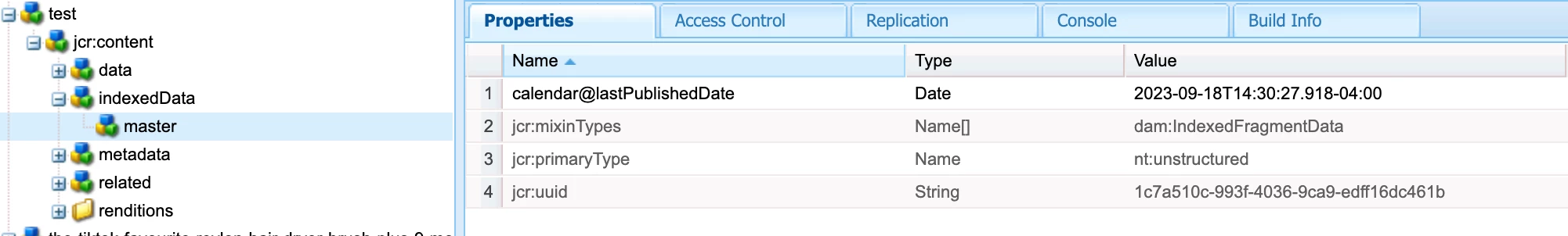 Also, it looks like AEM has some background process that creates the node indexedData/master with jcr:mixinTypes=dam:IndexedFragmentData when the content fragment is updated and/or published.