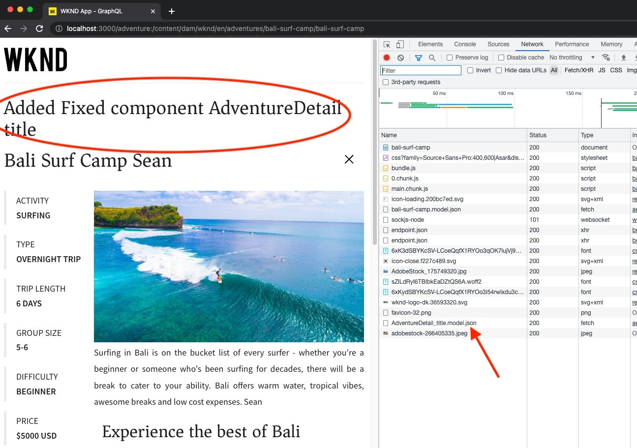 I am following this Remote SPA tutorial, and added a Fixed `AEMTitle` component to the AdventureDetail.js component below.