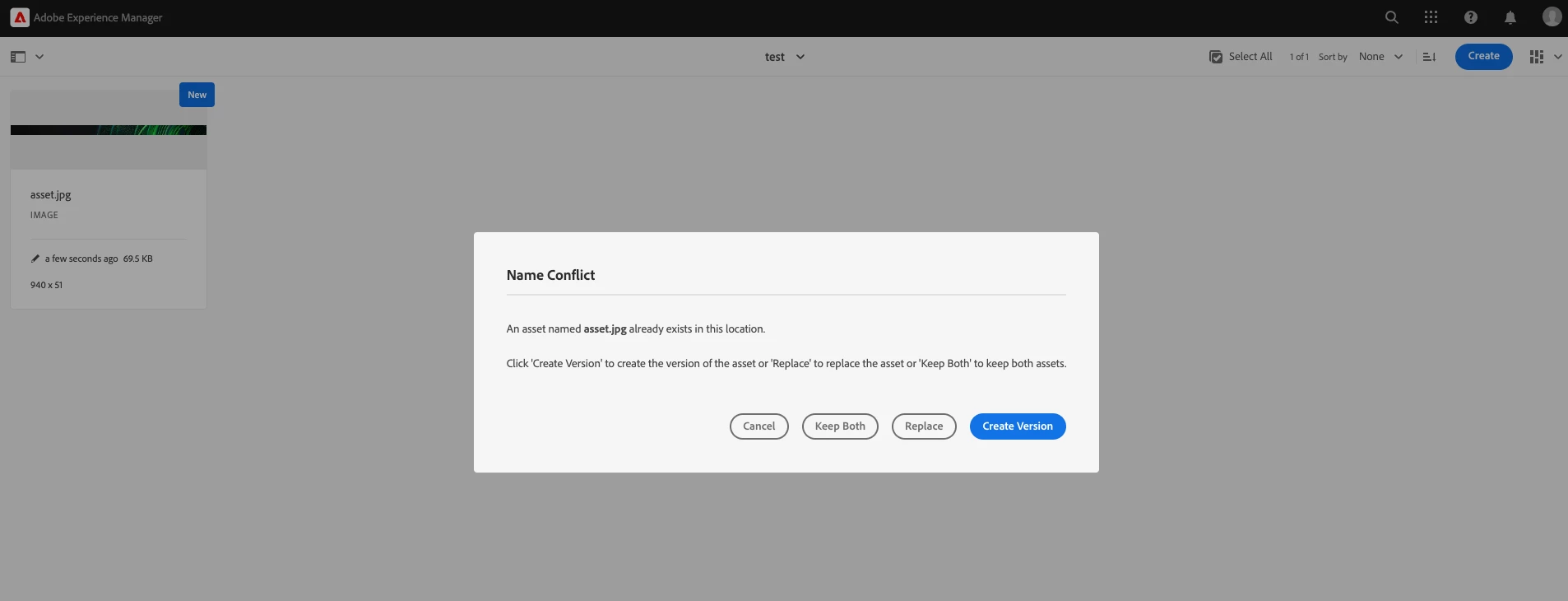 You will see the "replace" option when you upload an asset with the same name.