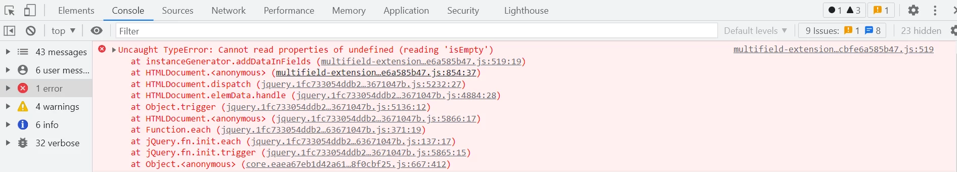 In above screenshots, the console error points to the below lines of code in multifield-extension-wrapper.js , this file was dependent on lodash.js under modern folder which was available under Libs folder (/libs/clientlibs/granite/lodash) till SP 6.5.9 and is missing in SP 6.5.10.
