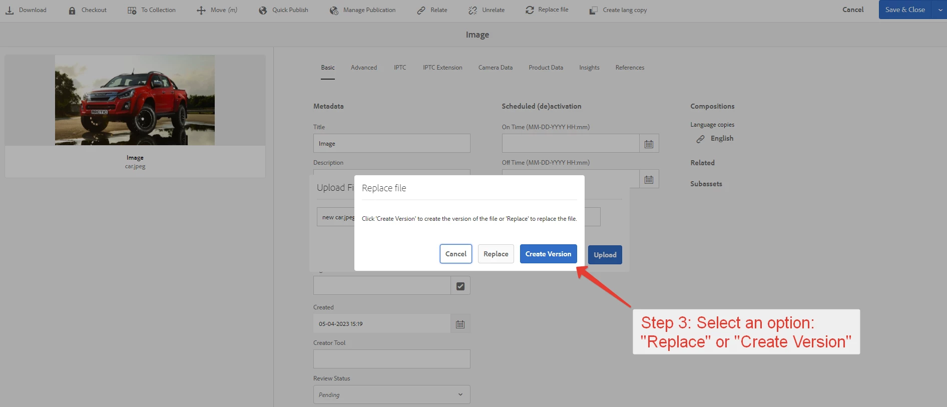 2. Content manager can choose 2 options: "Create version" or "Replace".