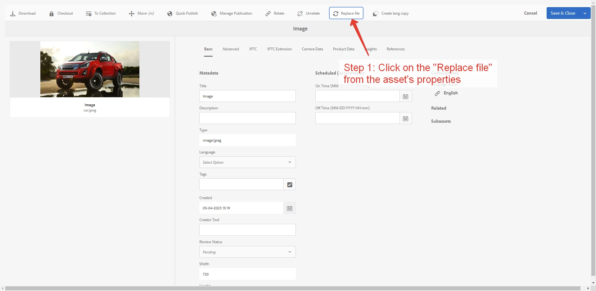 6. The button "Replace file" is displayed on menu above asset properties page.