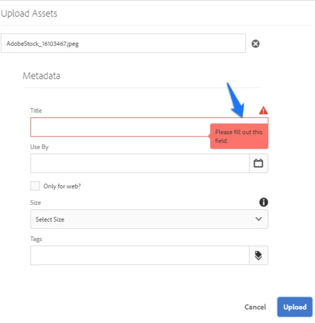 Add Metadata dialog fields while uploading DAM files or folders