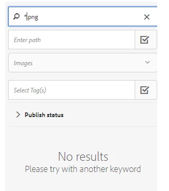 1. The search criteria is a "contains" criteria, not a regex, so to find all the assets containing ".png", you should simply put .png in the field. Here is an example of me searching for all JPGs in my assets: